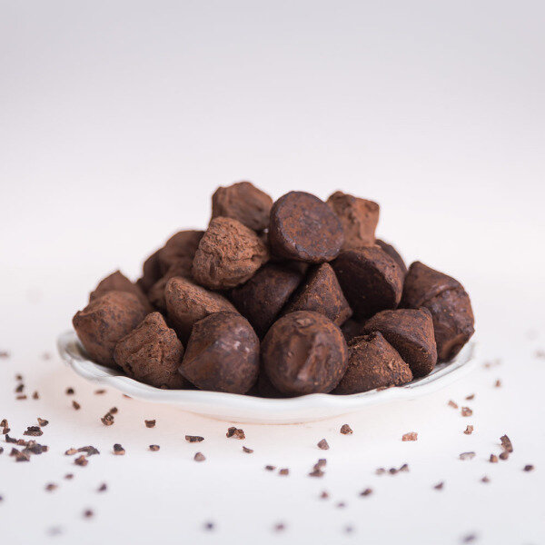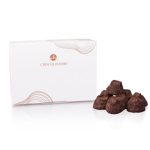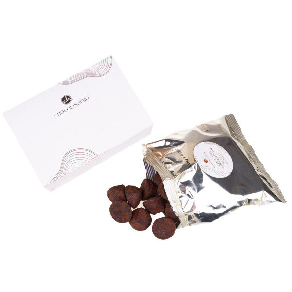 Delicious Belgian chocolate truffles with a filling of salted caramel and dusted with cocoa power. Packed in an elegant white box with winter motif.