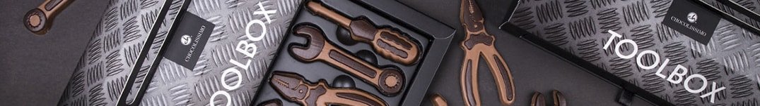 Vijf chocolade figuurtjes in de vorm van gereedschap. U vindt een hamer, een schroevendraaier, een tang een moersleutel en Engelse sleuteL Alle figuurtjes zijn gemaakt van Belgische melkchocolade en afgewerkt met pure chocolade.