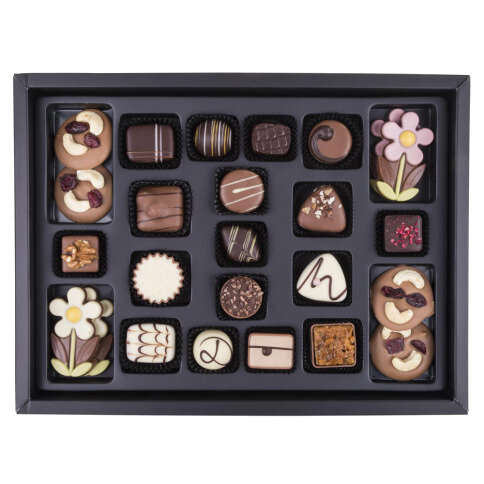 Ingredients: sugar, cocoa butter, cocoa mass, whole milk powder, vegetable fat: palm, rapeseed, sunflower, palm kernel, coconut, fractionated palm; roasted cashew nut, invert sugar syrup, butter oil, sorbitol syrup, skimmed milk powder, glucose syrup, cranberry, humectant: E422; almonds, lactose, macadamia nuts, vegetable oil: sunflower, rapeseed; whole milk, dextrose, water, wheat flour, emulsifier: soy lecithin, E471, sunflower lecithin, rapeseed lecithin; whey powder, hazelnuts, honey, natural flavouring: vanilla, walnut, pear, almond, raspberry, carrot; stabiliser: E422, E440, E452, E452I; skimmed cocoa powder, raspberries, concentrated: raspberries, apples, radish, black currants, spirulina; pistachios, crushed cocoa beans, fructose, rice flour, fat-reduced cocoa powder, cream powder, coffee, caramelized sugar, extract: vanilla, safflower, spirulina; natural flavouring - contain milk, natural flavours, acidity regulator: E330, E331, E333iii, E333; milk fat, acid: E330, E333; concentrated butter, modified starch, red beetroot juice powder, salt, concentrated juice: chokeberry, black currants; Bourbon vanilla powder, gelling agent: pectin; barley malt, juice from concentrate: fruits; raising agent: E500, E503, E501; glucose-fructose syrup, E1103, maltodextrin. Cocoa solids in milk chocolate minimum 28%. Contains vegetable fats in addition to cocoa butter. May contain eggs, peanuts, sesame .