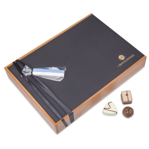 De dertig pralines zitten verpakt in drie schuifjes in een uniek houten kistje, donker gelakt, met bovenaan een "Merci" bedrukking. Om dit boodschap nog duidelijker te maken kan u uw eigen wensen laten toevoegen met een gravure, met een maximum van 25 tekens.