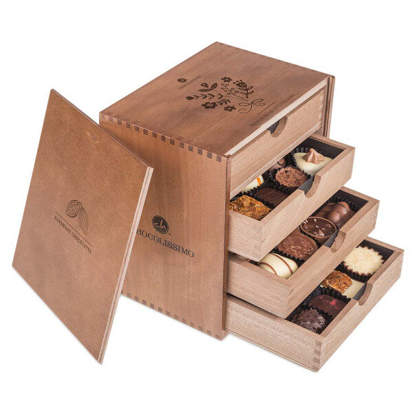 Maar liefst veertig exclusieve pralines zijn verborgen, verdeeld over de vier schuifjes, van dit geweldige kistje. Alle pralines hebben een vulling van de hoogste kwaliteit aan ingrediënten, de pralines zelf zijn gemaakt van de allerbeste Belgische chocolade.
