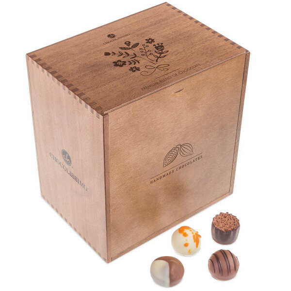 The luxurious wooden box, in which 40 pralines are hidden, is made of African wood. The wooden box is decorated with a Christmas motif.
