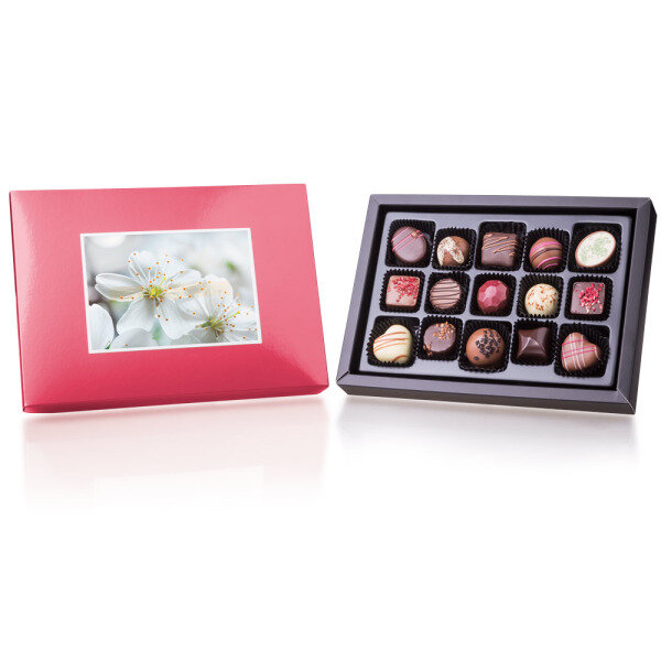 15 handmade pralines in a nice box with heart. In the lid you can put a postcard from our offer or upload your own photo or image. A very nice gift for your loved one or anybody else that is close to your heart.