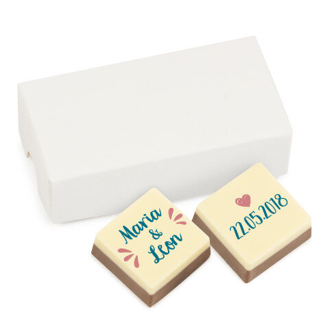 Set van 2 vierkante blokjes van Belgische chocolade - bedrukt, verpakt in een mooi doosje.