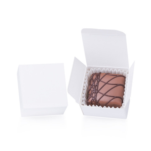 De praline wordt netjes verborgen in een stijlvol wit doosje.