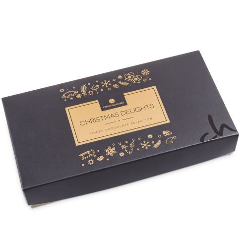 De pralines zijn verpakt in een zwart met goudkleurig doosje, versierd met een schitterend kerstmotief.