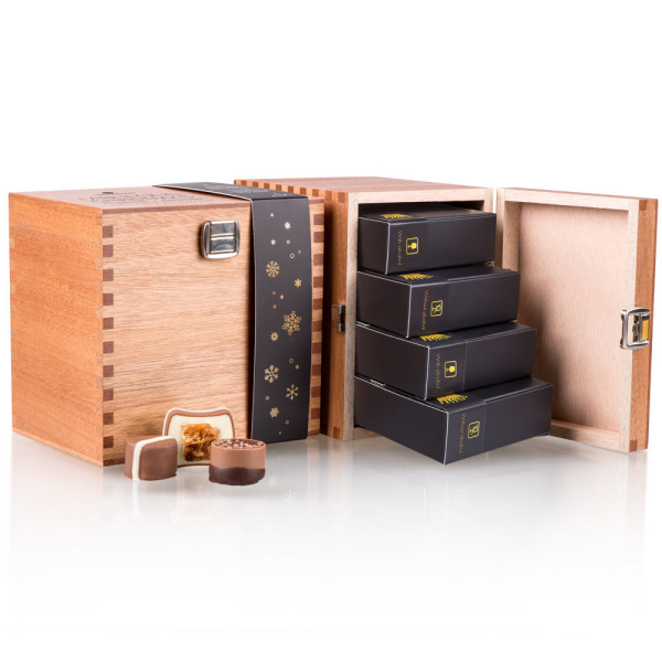 De aroma's en rijke smaken van deze heerlijke pralines zijn verpakt in een stijlvol houten kistje voorzien van een kerstmotief en Merry Christmas wensen.
