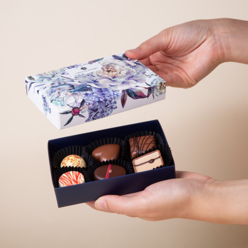 De combinatie van zes heerlijke pralines, gemaakt van de beste Belgische chocolade en een elegant blauw doosje met een bloemenmotief op het deksel.