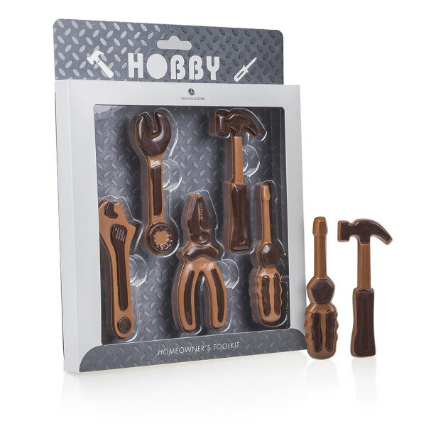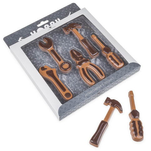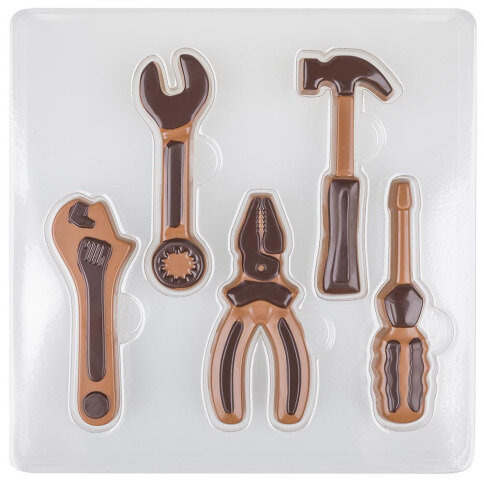 Vijf chocolade figuurtjes in de vorm van gereedschap. U vindt een hamer, een schroevendraaier, een tang een moersleutel en Engelse sleuteL Alle figuurtjes zijn gemaakt van Belgische melkchocolade en afgewerkt met pure chocolade.