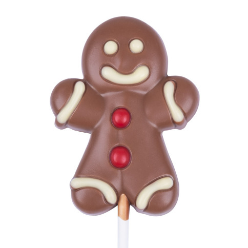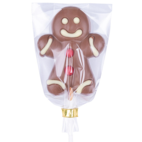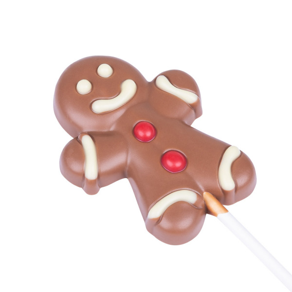 Een grappig chocolade figuurtje in de vorm van een gingerbread mannetje als chocolade lolly.