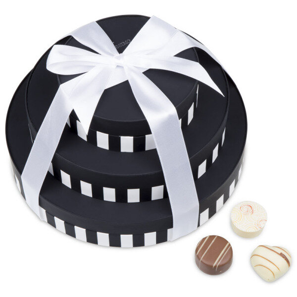 Voor wie het ook iets meer mag zijn, voor wie een beetje veeleisender is, is deze set misschien wil een goed idee. 3 ronde doosje, in zwart met wit gestreept design, op elkaar gestapeld en samengebonden met een wit lint.