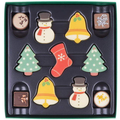 Niet minder dan 7 platte chocolade figuurtjes gemaakt van witte chocolade. Allen zijn versierd met een eetbare print. U vindt 2 kerstboompjes, 2 sneeuwmannetjes, twee belletjes en een kerstsok.