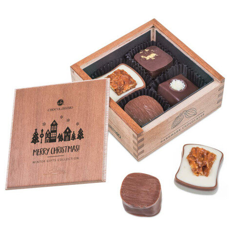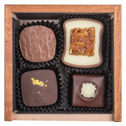 Binnenin 4 heerlijke pralines gemaakt van Belgische chocolade en kwaliteitsvolle ingrediënten, allen zonder alcohol.