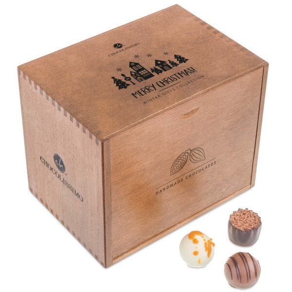 An exclusive box made from African wood, provided with 3 drawers and an extendable lid. On top of the wooden box there is a print of a nice Christmas motif and Merry Christmas wishes.