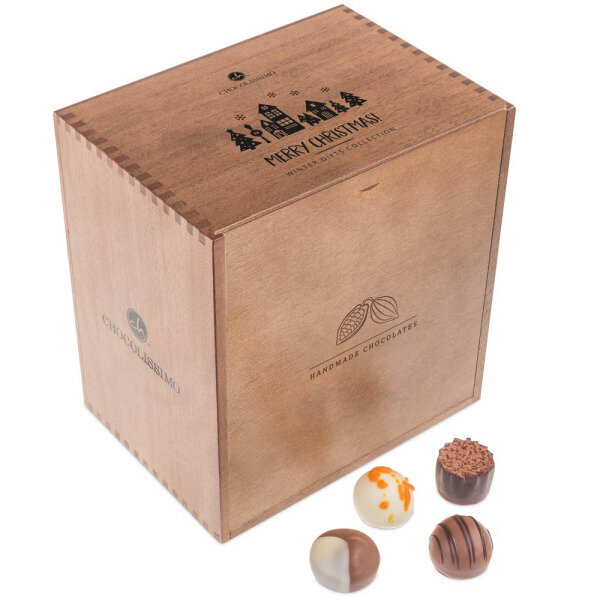 These 10 selected pralines are packed in a dark wooden box which is, for the occasion, decorated with a subtle Christmas image and Merry Christmas wishes.