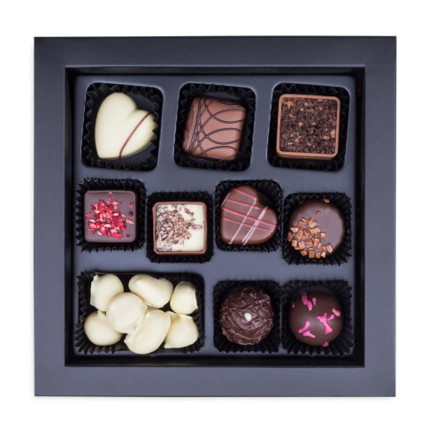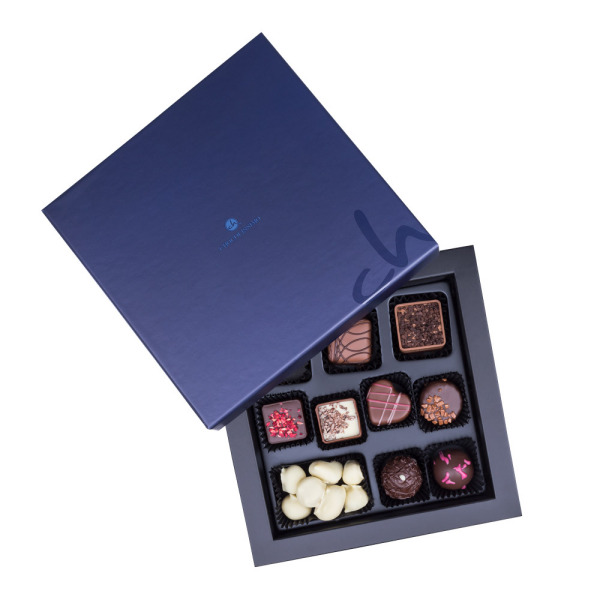 A set of delicious handmade chocolates packed in an elegant blue box with a grey ribbon. A classic but timeless gift that will be appreciated for every occasion. In the set you will find 9 pralines and snacks with raisins with rum in white chocolate.