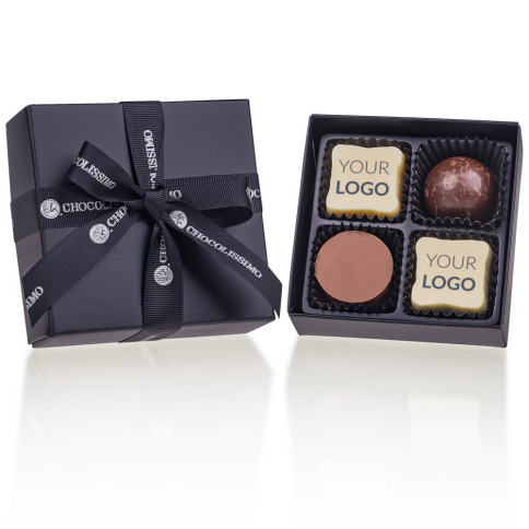 Personaliseer nu uw eigen pralines met deze Oxide Black XS. U vindt vier heerlijke pralines gemaakt van Belgische chocolade en een kwaliteitsvolle vulling, allen zonder alcohol.