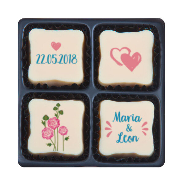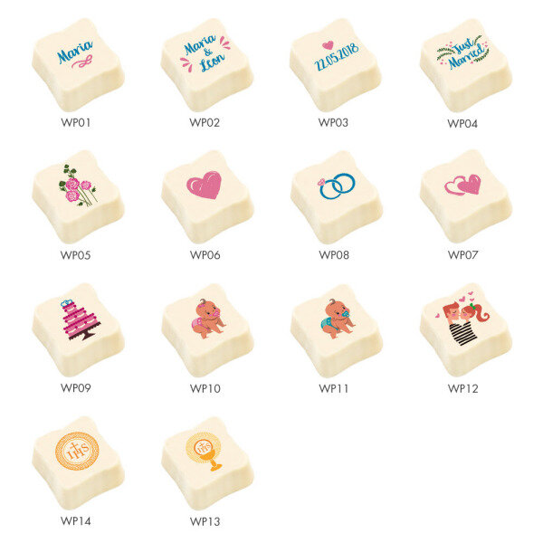 Selecteer de gewenste bedrukingen op de chocolade blokjes en stuur ons (zodra de bestelling is geplaatst) uw keuze via mail op info@chocolissimo.be. Vermeld in uw e-mail uw bestelnummer, de gekozen symbolen voor de bedrukking en hun inhoud (bijv. uw datum en uw namen).