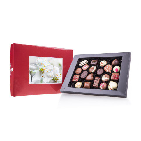 Twintig van de heerlijkste pralines, verpakt een doosje met een rood deksel. Het deksel kan u zelf personaliseren door uw foto of postkaart te uploaden, of er eentje te kiezen uit ons assortiment.