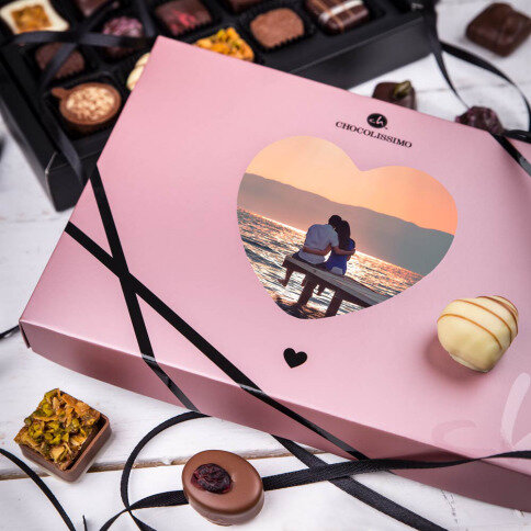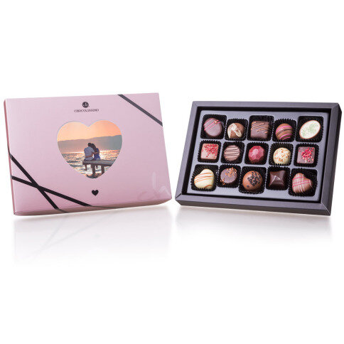 15 heerlijke, handgemaakte pralines verpakt in een doosje met hart. In het deksel kan u een postkaart of uw eigen foto laten plaatsen, door deze eenvoudigweg zelf te uploaden, of een postkaart te kiezen uit ons uitgebreide aanbod. Een prima geschenk voor uw geliefde of eender wie die u na aan het hart ligt.