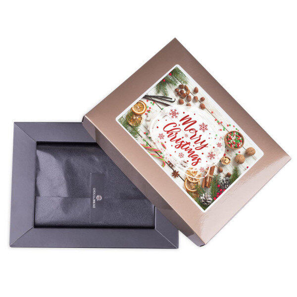 De postkaart in het deksel kan gepersonaliseerd worden. Kies zelf de gewenst postkaart uit ons assortiment of upload uw eigen foto. Daarna voegt u een tekst of wensen toe. Wij printen en bevestigen deze dan in het deksel.