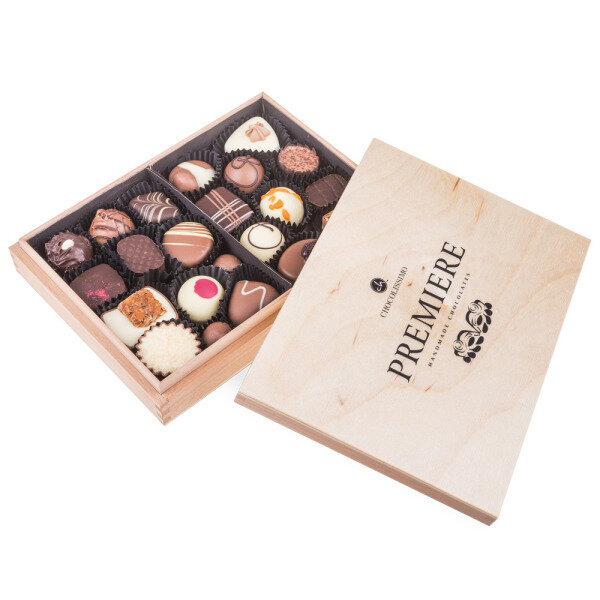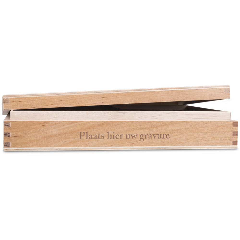 De pralines worden voorzichtig verpakt in het licht houten kistje met prachtige decoratie. Om het helemaal volledig te maken kan u op de zijkant wensen of een persoonlijke boodschap laten graveren met een maximum van 25 tekens.