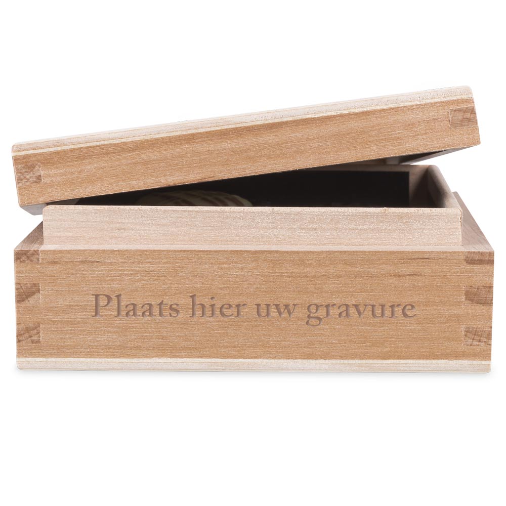 The pralines go together in a light wooden box, which is timeless but stylish. To complete it all, you have the option to have wishes or a message engraved on the side. It can't get much more personal. No matter who you give it as a present, every adult can't help but be happy with it. It is neutral, so suitable for both women and men, for any occasion.