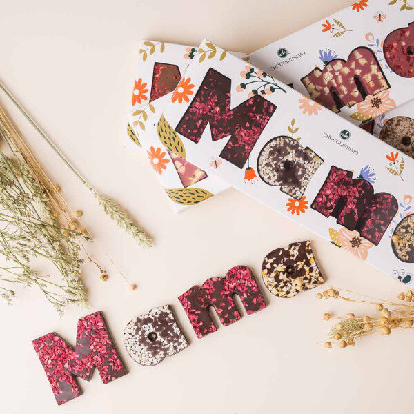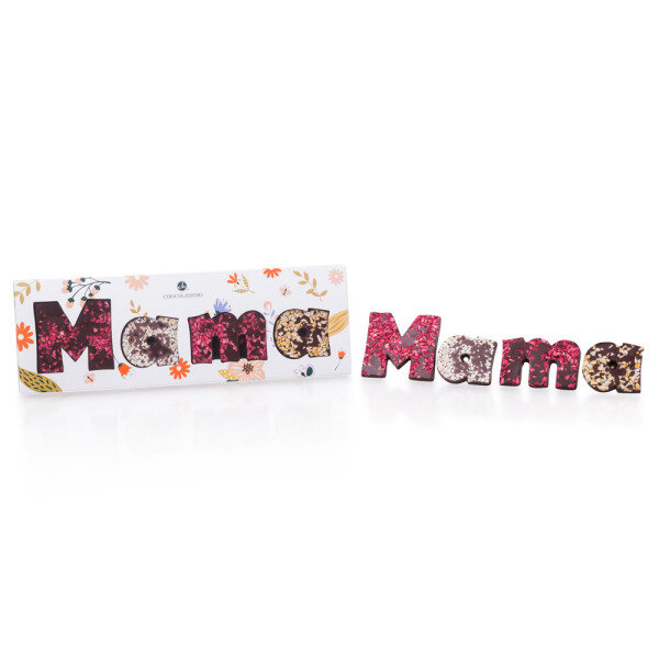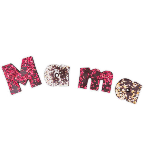 Mama gaat zo blij zijn, met deze chocolade letters, gemaakt van melkchocolade. De letters M en m zijn versierd met gedroogde aardbeien, één a met kokossnippers en de tweede a met amandelsnippers. De chocolade letters worden daarna verpakt in een fleurig doosje met vensters.
