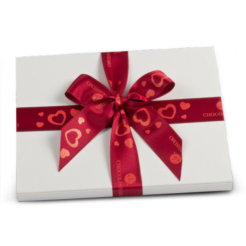 Rood geschenklint met hartjes en Chocolissimo-logo.