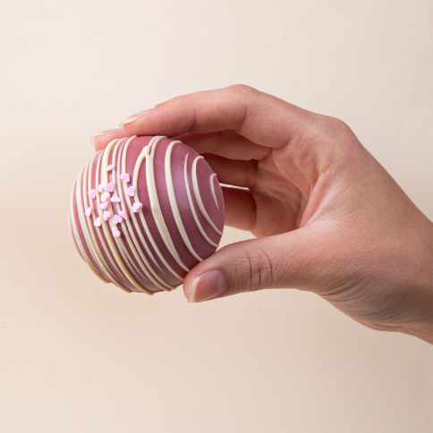 Ruby chocolade heeft van nature en fruitige, zoet-zure smaak en bevat geen smaak-of kleurstoffen. De chocolade bal is handgemaakt en is versierd met witte chocolade en suiker hartjes en gevuld met mini-marshmallows. Verpakt in een leuk doosje.