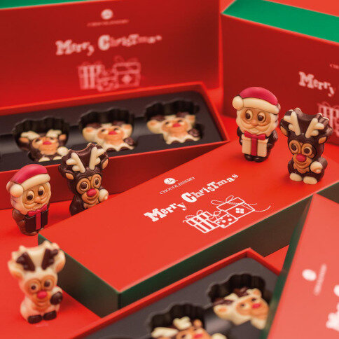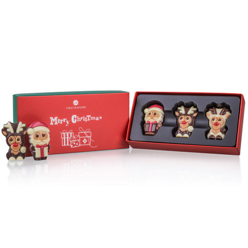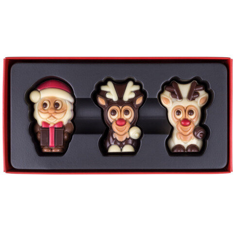 Een heerlijk setje met drie chocolade figuurtjes in de vorm van de kerstman en twee rendiertjes. Gemaakt van Belgische chocolade en gedetailleerd versierd. Allemaal hebben ze een hazelnootvulling.