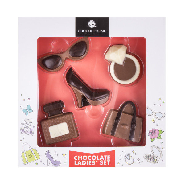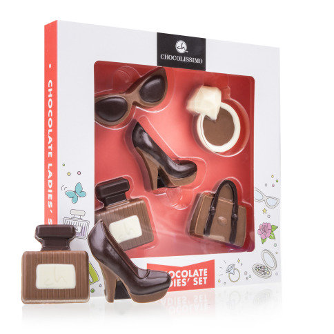 In dit setje chocolade figuurtjes vindt u alles om de harten van trendsetters en modebewuste personen sneller te doen slaan. U vindt een zonnebril, een flesje parfum, een stijlvolle handtas, een dure ring en een damesschoen. Uiteraard allemaal gemaakt van Belgische pure, witte en melkchocolade. De figuurtjes zijn afgewerkt met oog voor detail en niet hol, maar massief chocolade.