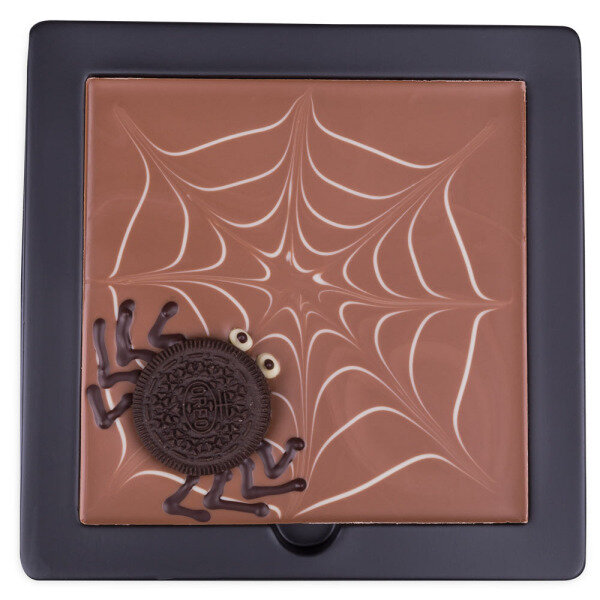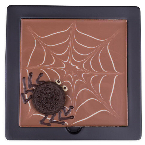 Een plat chocolade figuurtje in de vorm van een schattige pinguïn met een rode sjaal en oorverwarmers. Gemaakt van heerlijke melkchocolade, afgewerkt met witte chocolade en kleurrijk versierd.