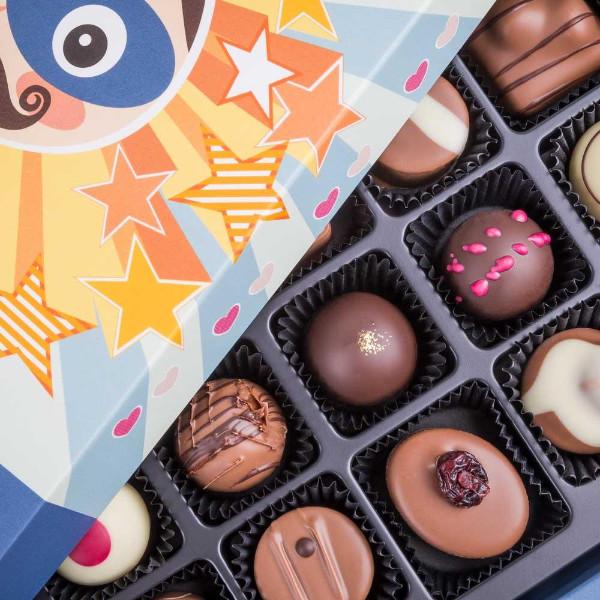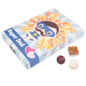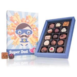 Ook papa laat zich al eens graag verwennen. Deze 15 handgemaakte pralines, verpakt in een grappig doosje met een stripfiguurachtige tekening zal van papa een echte superheld maken.