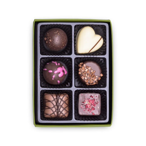 In this special box you will find 6 lovingly made pralines, all made from Belgian chocolate and the best ingredients. Each praline is a gem in itself, which will always surprise your mother with a taste explosion.