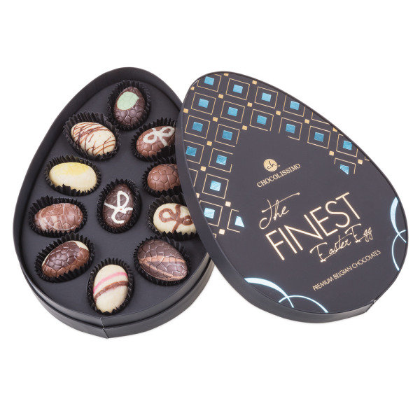Nog voor het wordt geopend zal wie dit doosje krijgt versteld staan. Maar dan hebt u de echte verrassing nog niet gezien, want binnenin vindt u elf heerlijke, speciaal geselecteerde gevulde chocolade paaseitjes. Ze zijn gemaakt van Belgische chocolade en hebben een heerlijke vulling van de beste ingrediënten en zonder alcohol. Eén voor één zijn ze trouwens prachtig versierd.