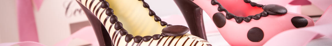 Een prachtige creatie in de vorm van een chocolade schoen, vervaardigd van gekleurde cacaoboter. De afmetingen van de schoen zijn: lengte: 16 cm, hoogte 13 cm en breedte 6,5 cm.