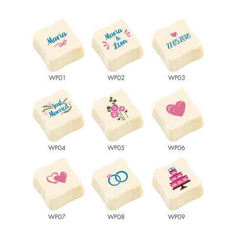 Selecteer de gewenste bedrukingen op de chocolade blokjes en stuur ons (zodra de bestelling is geplaatst) uw keuze via mail op info@chocolissimo.be. Vermeld in uw e-mail uw bestelnummer, de gekozen symbolen voor de bedrukking en hun inhoud (bijv. uw datum en uw namen).