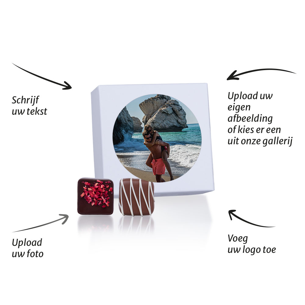The elegant white box in which the pralines are packaged can be personalized on the lid with a sticker. Upload your own photo or choose one of our images. Add a text and we will print the sticker and stick it on the lid.