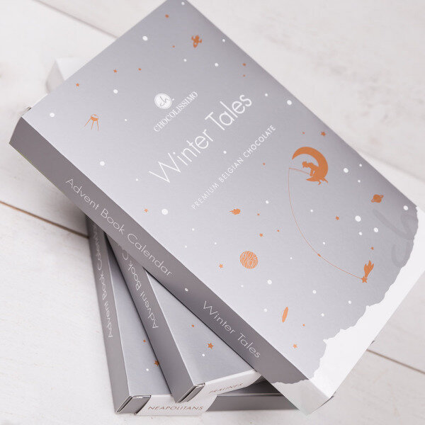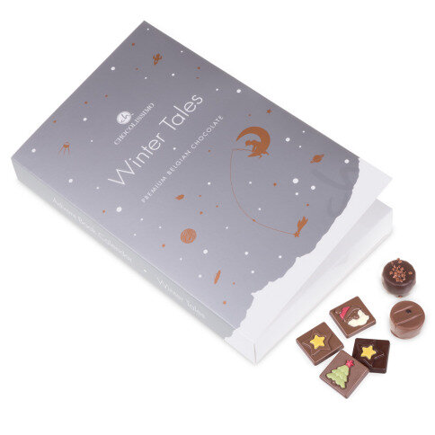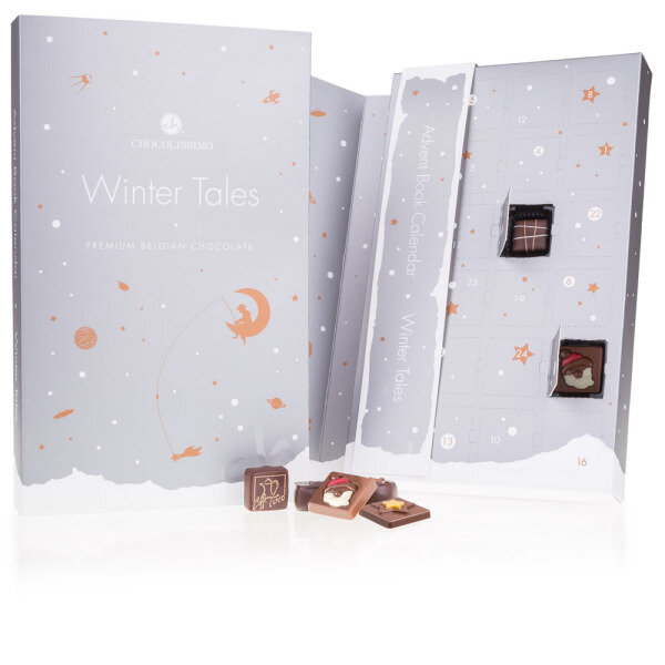 A silver coloured Advent Calendar from the Winter Tales series, in a book shape. Behind the 24 doors you will find 12 delicious pralines and 12 mini-chocolates or napoliltans, decorated with Santa Claus, a Christmas tree and Christmas stars.
