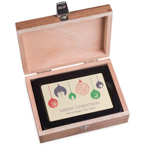 Het chocolade visitekaartje wordt verpakt in een stijlvol donker houten kistje van Afrikaans hout. Op het deksel opnieuw een kerstafbeelding en kerstwensen.