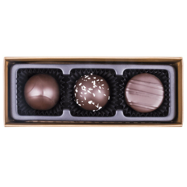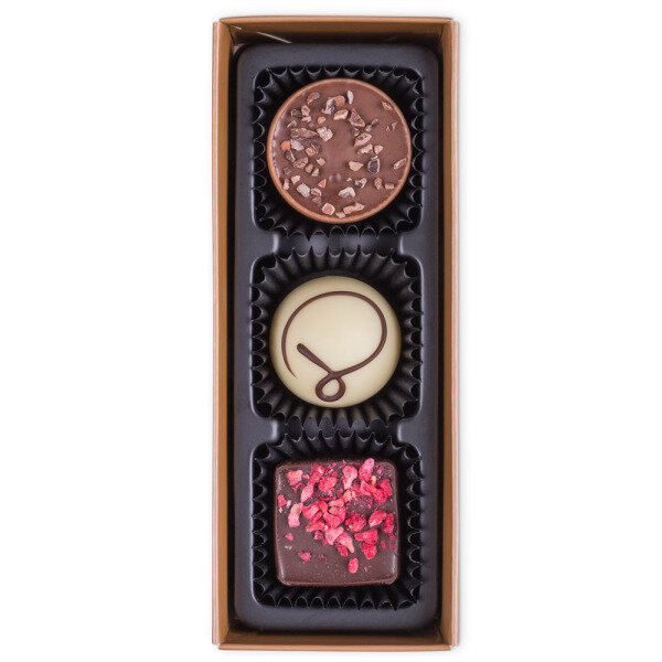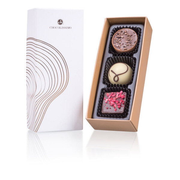 30 handgemaakte pralines, in 3 laagjes van 10, in een stijlvol doosje. Dit geschenk is een succes bij elke gelegenheid. Of misschien wil u gewoon uzelf verwennen. Alle pralines zijn gemaakt van de beste chocolade en hoogste kwaliteit aan ingrediënten, volgens de beste traditionele recepten. Het stijlvolle doosje wordt verpakt in zilverkleurig geschenkpapier en verbonden met een zwart lint.