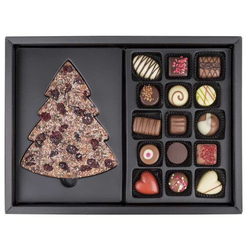 In totaal 15 overheerlijk pralines, gemaakt van Belgische chocolade met kwaliteitsvolle ingrediënten. Dit samen met een chocolade tablet (160 g) in de vorm van een kerstboom, gemaakt van Belgische melkchocolade en versierd met onder andere gedroogde veenbessen en gemalen cacaobonen.