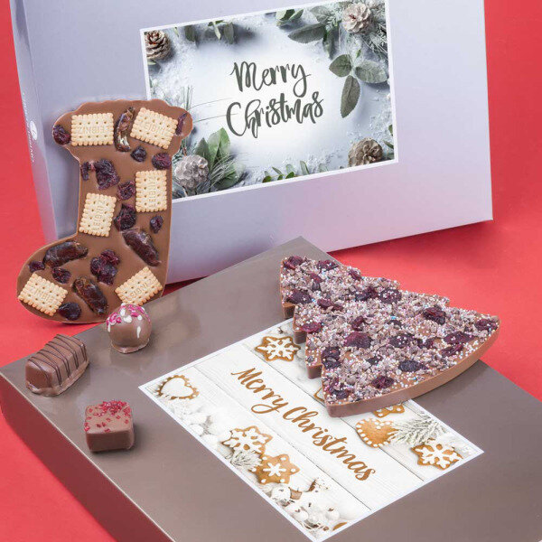 Een uniek kerstcadeau met een chocoladereep, pralines én een postkaart.