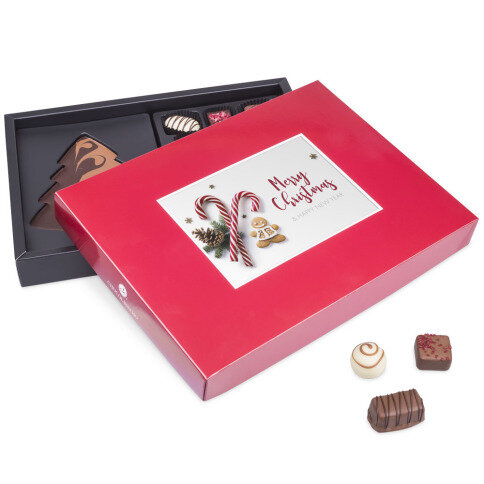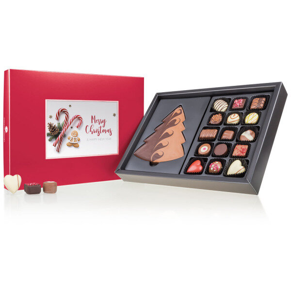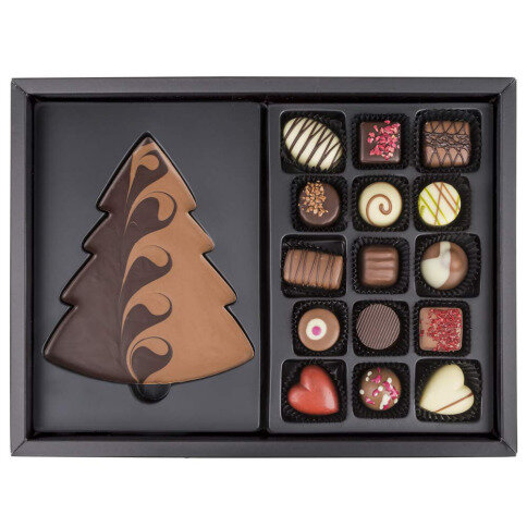 Boîte de 15 chocolats faits main et un arbre de Noël en chocolat (160 g). Le couvercle de la boîte peut être décoré par une photo de votre choix ou par un de nos élégants motifs de Noël.