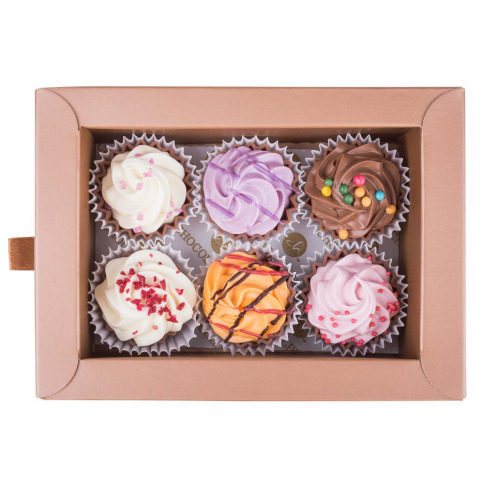Kleurrijk en opvallend, als het doosje wordt geopend of op tafel worden gezet. Maar vooral ook heel lekker, deze pralines in de vorm van klassieke cupcakes. Gemaakt van Belgische chocolade, allen met een heerlijke vulling.