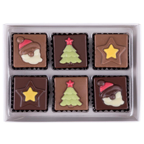 Uitzonderlijk lekkere chocolaatjes met een kleurrijke decoratie. De napolitans zijn gemaakt van Belgische pure en melkchocolade en zijn allen versierd met kleurrijke kerstboompjes, kerststerretjes en kerstmannetjes.