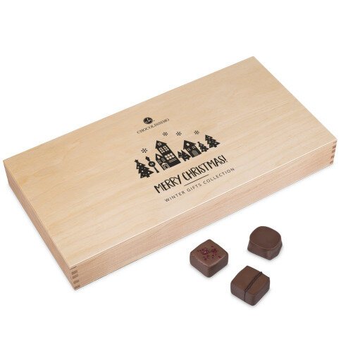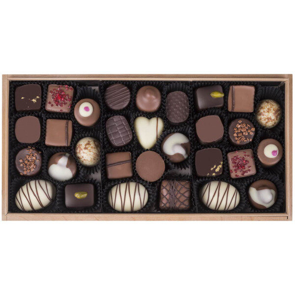 Open het houten kistje en laat u verrassen door 30 buitengewoon heerlijke pralines, allen zonder alcohol. Gemaakt van Belgische chocolade met vullingen van kwalitatieve ingrediënten.